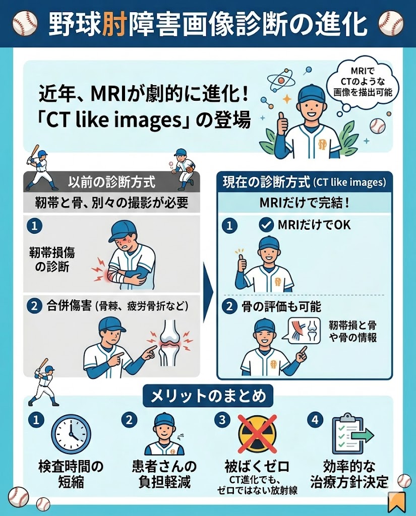従来、野球肘障害に伴う骨の異常を評価するためにはCT検査が必要でした。例えば、肘の靱帯損傷を評価する際にはMRIを用いますが、肘頭の骨棘や疲労骨折などが疑われる場合には、追加でCTを撮影し、両者を併せて診断・治療方針を決定する必要がありました。